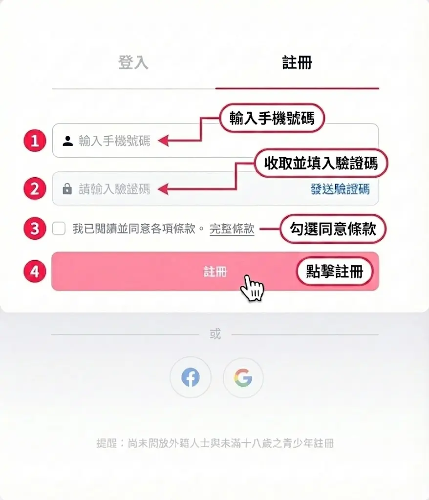 我們提供「手機號碼」與「社群帳號」兩種註冊方式,您可以選擇最適合您的一種方式: