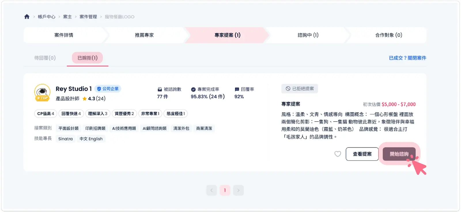 A: 先別急著婉拒!建議您可以點選 「開始諮詢」,誠意地告知專家您的預算考量。很多時候,專家願意為了好案子調整服務內容(例如:減少修改次數、調整交期)來符合您的預算。直接婉拒可能就錯失了一個好合作囉!