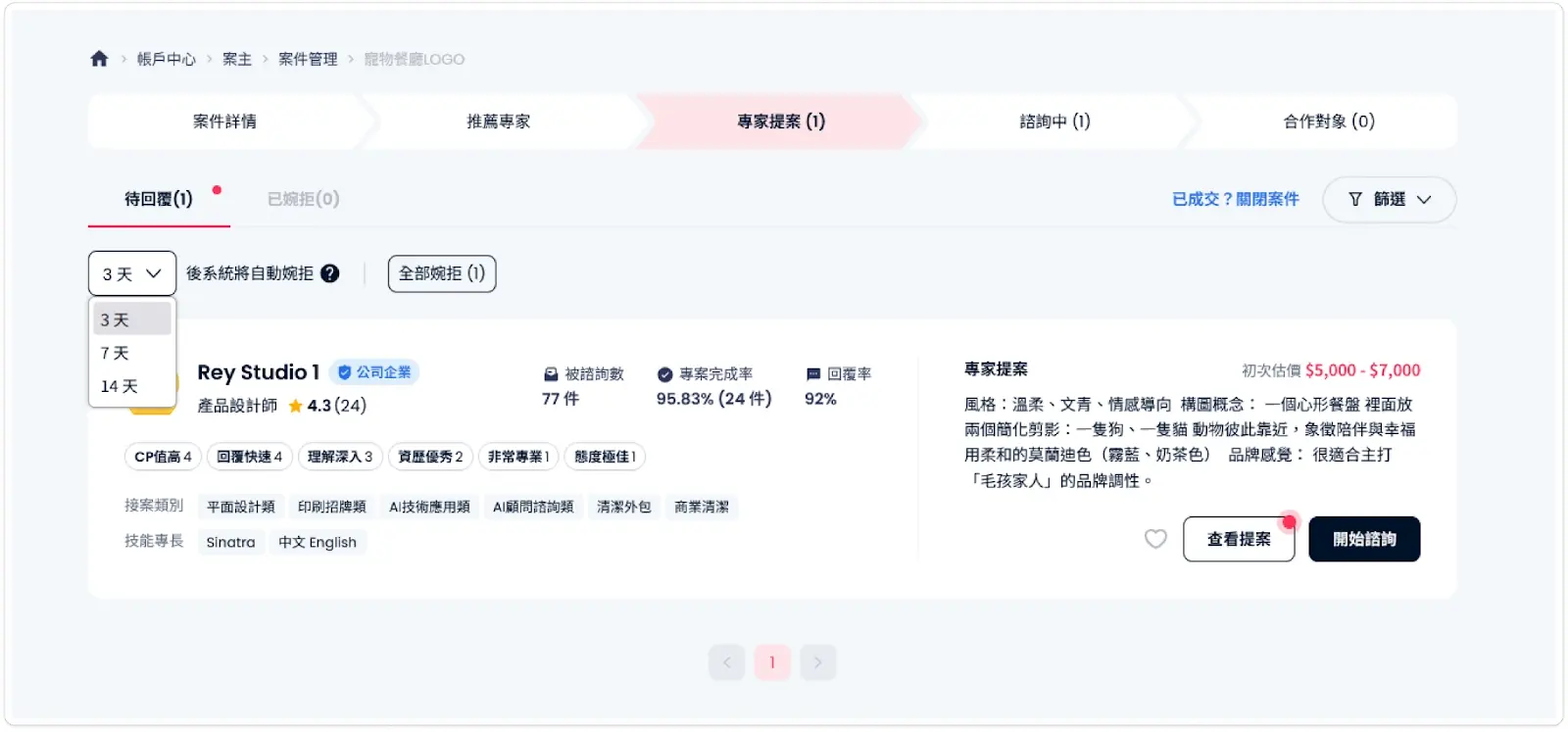 在提案列表左上方,您可以設定天數(如 3天 / 7天 /14天)。若超過設定天數您未進行任何操作,系統會貼心地幫您自動婉拒,避免讓專家無止盡地等待。