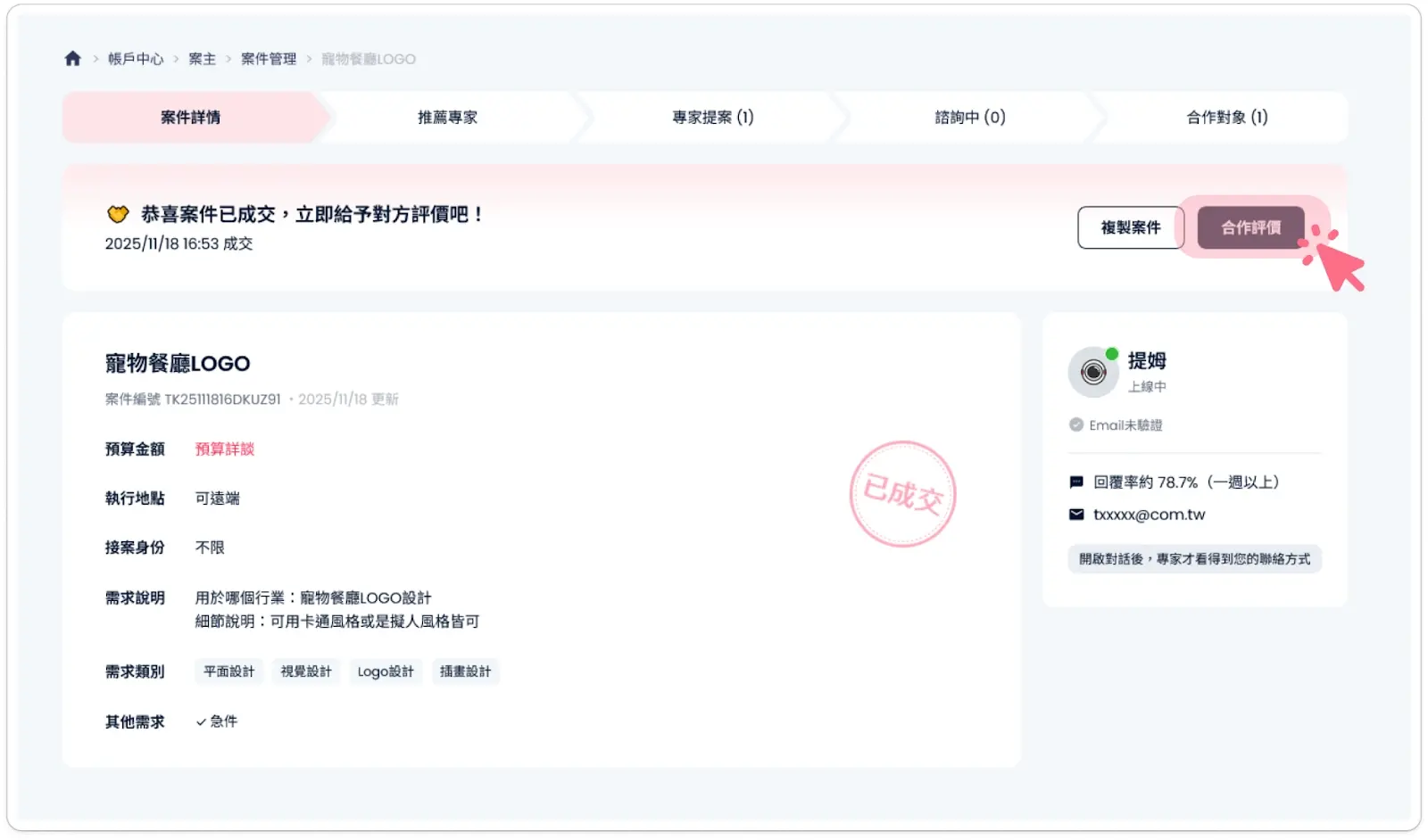 方法一:從「案件詳情」頁進入 在案件詳情頁的最上方,會顯示「已成交」的通知區塊。直接點選右側深色的 「合作評價」 按鈕即可。