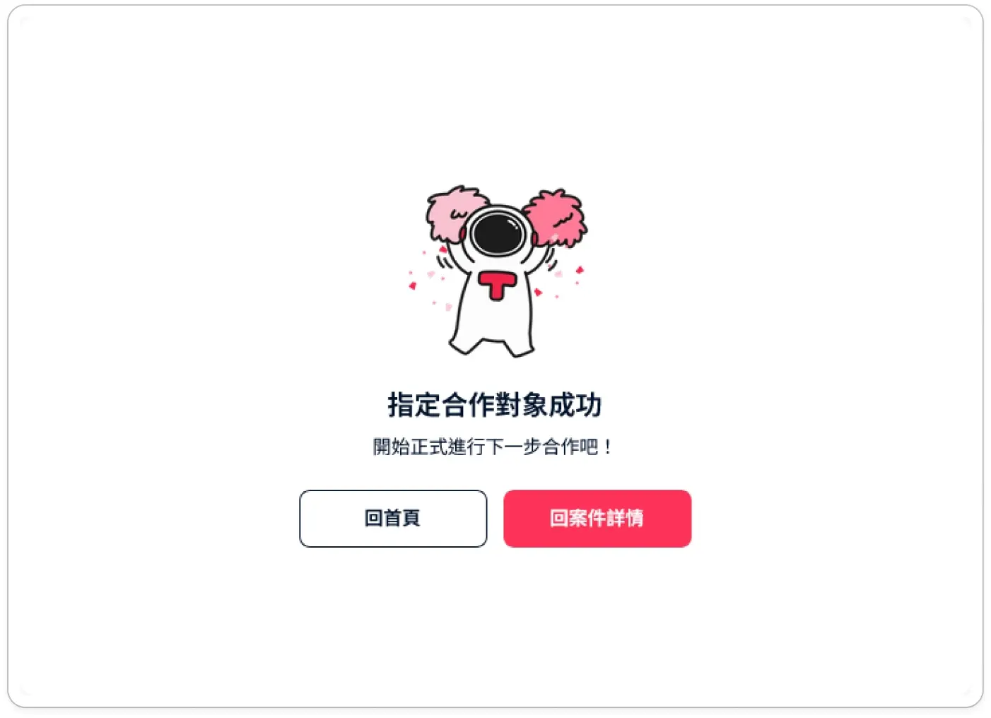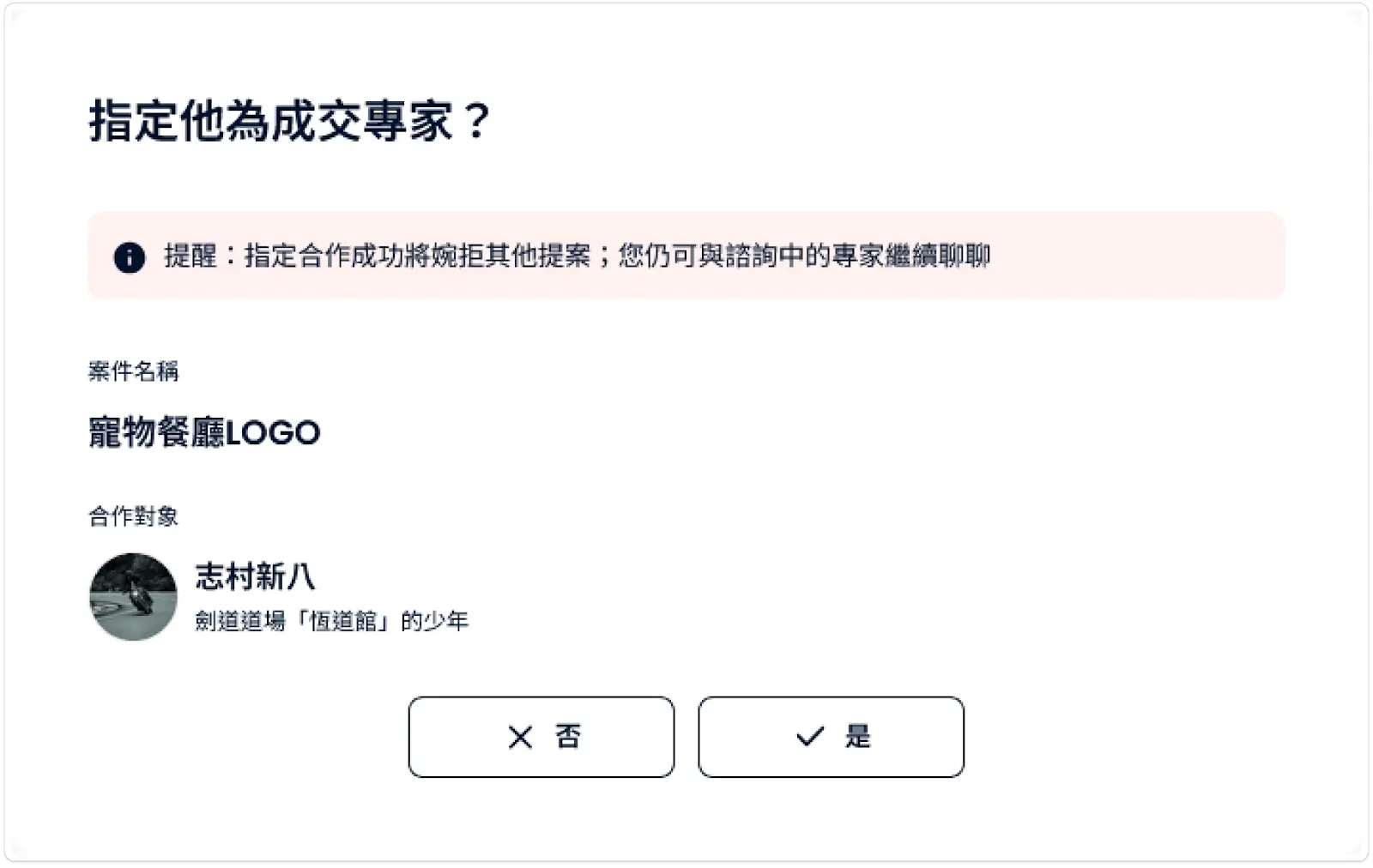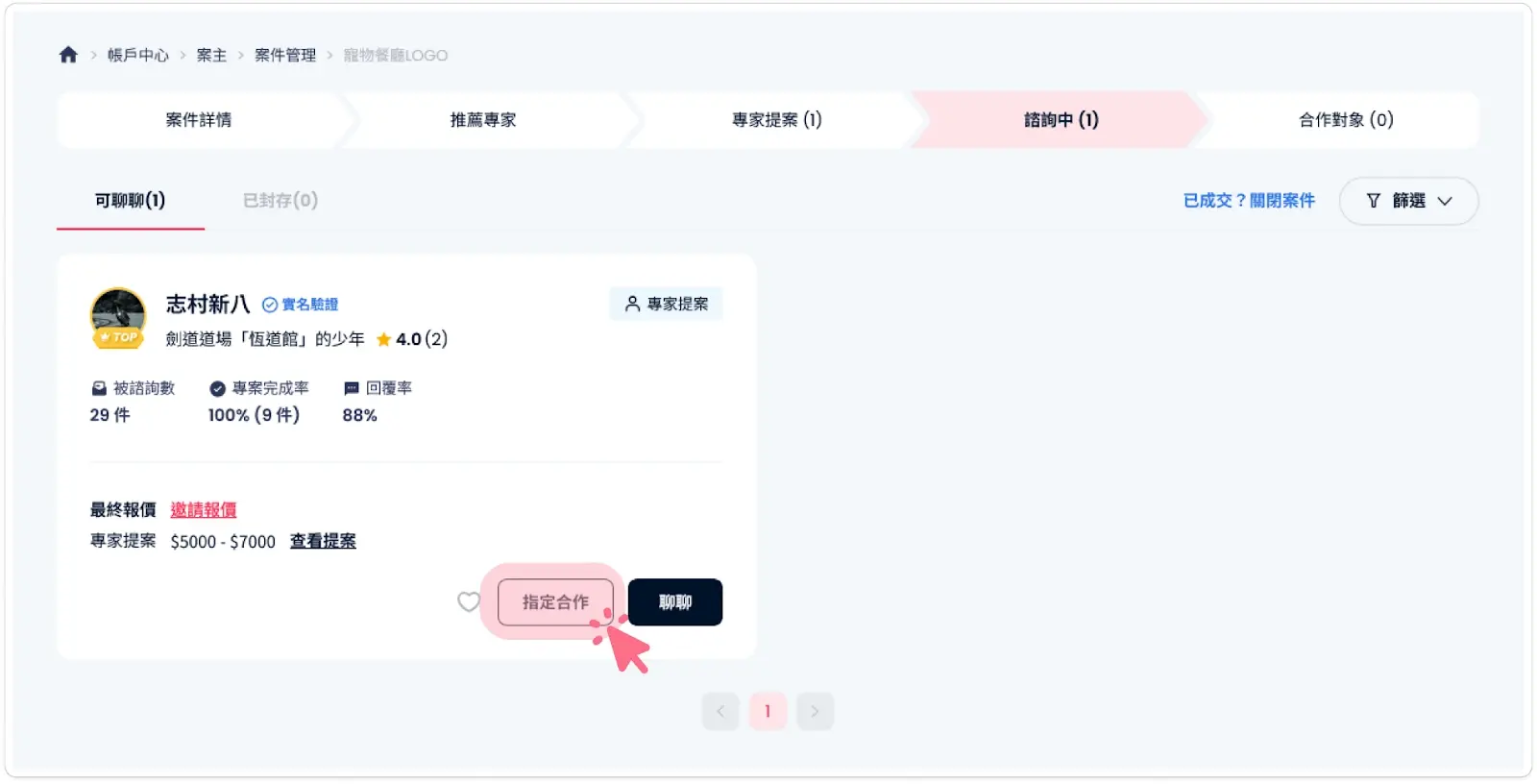 指定後狀態: 該位專家將成為您的正式合作對象。