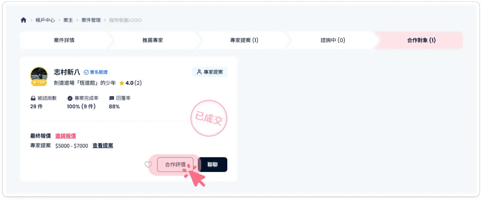 給予評價: 待合作順利結束後,別忘了回來點選 「合作評價」,給予專家正面的鼓勵喔!
