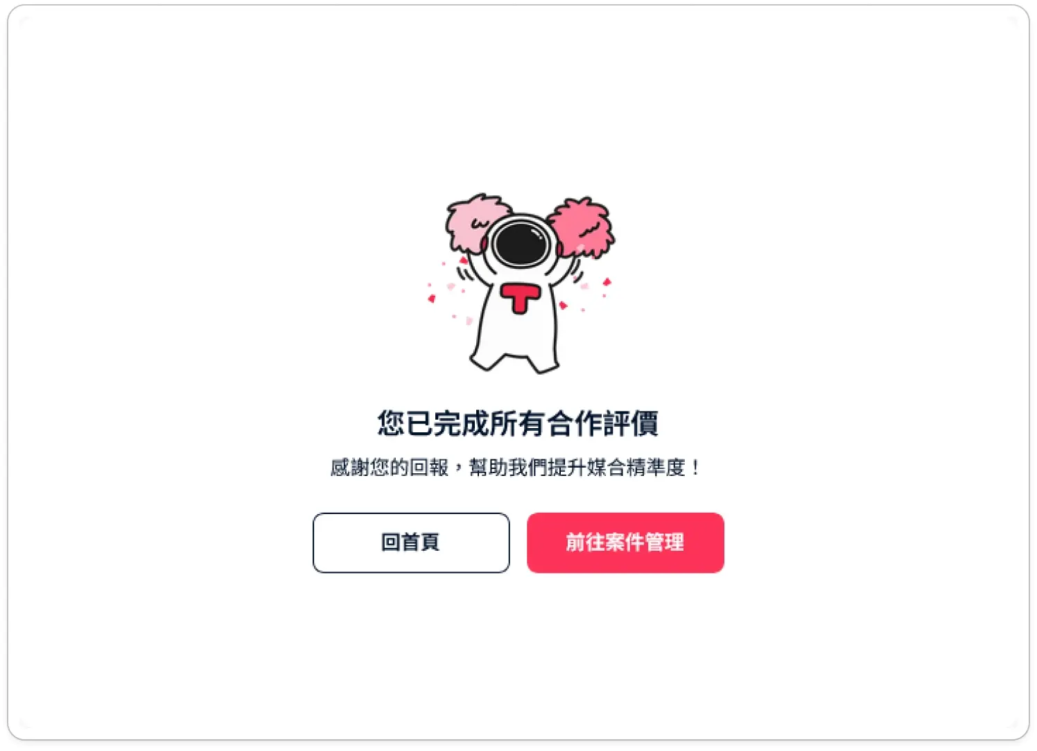 填寫完成並送出後,出現此畫面即代表評價成功!您可以選擇回首頁或前往案件管理。