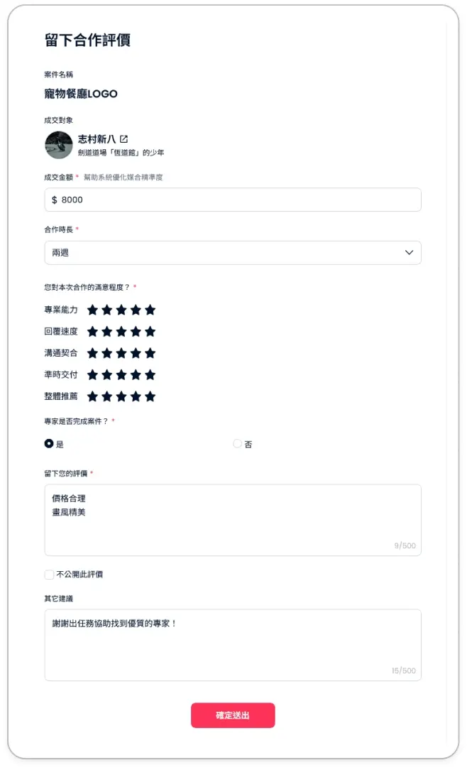 系統會跳出評價表單,請依照實際合作體驗填寫: