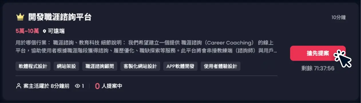 搶先提案:若你屬於平台上的 Top 專家,能優先向高價值案件提出你的規劃。
