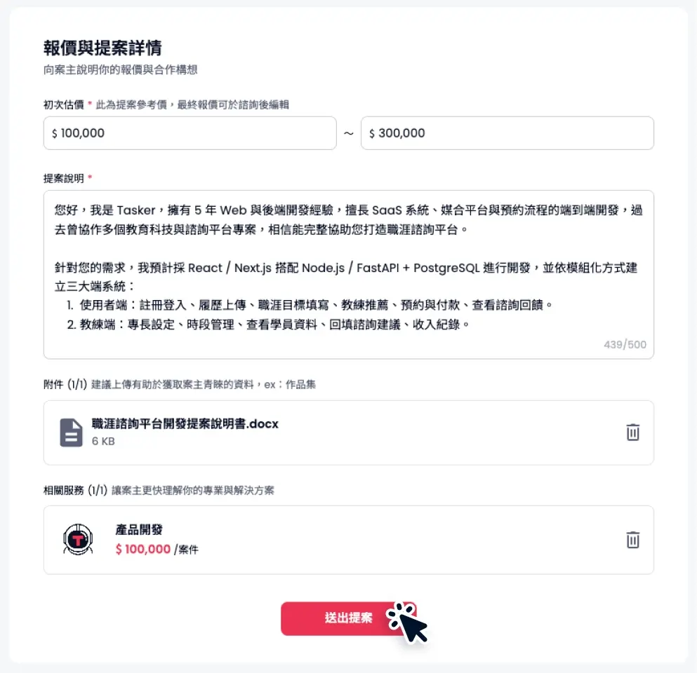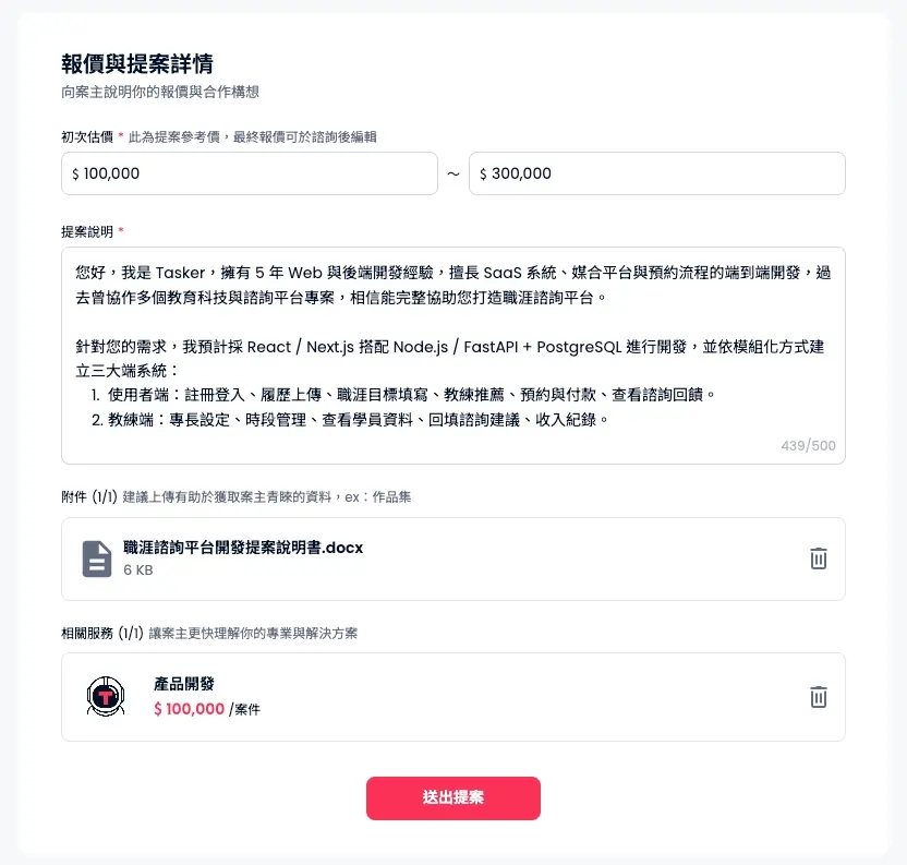 送出後不可修改,也不可重複提交。若有需要補充內容,可在案主回覆開啟洽談後再提供資訊。