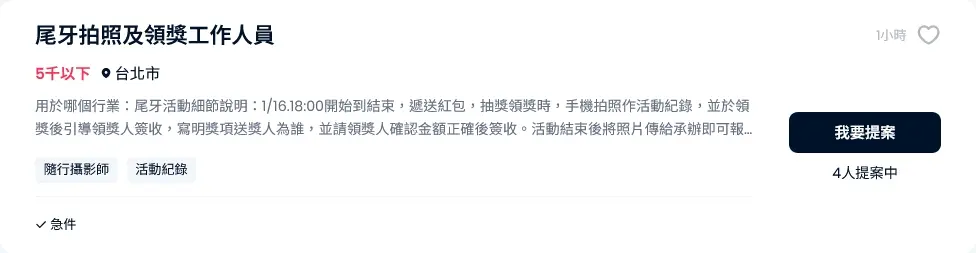 看到適合的案件,請立即點選 【我要提案】。展現您的專業見解與誠意,好機會不等人!