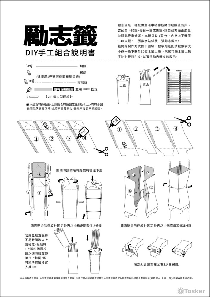 勵志籤採DIY製作,買家可藉紙製勵志籤筒磨練手藝,同時又能藉由抽籤取得籤上數字,並⽐對籤詩內⽂,以獲得籤⽂的啟⽰。