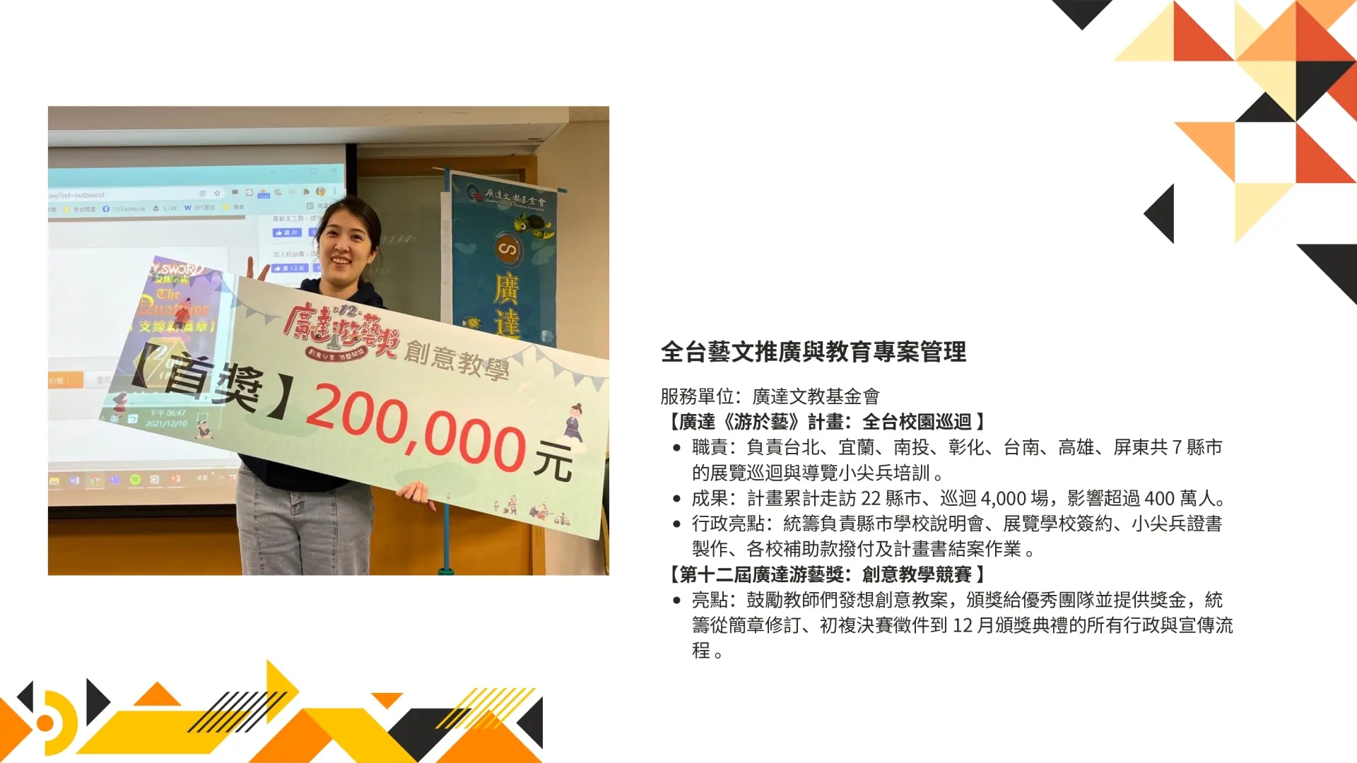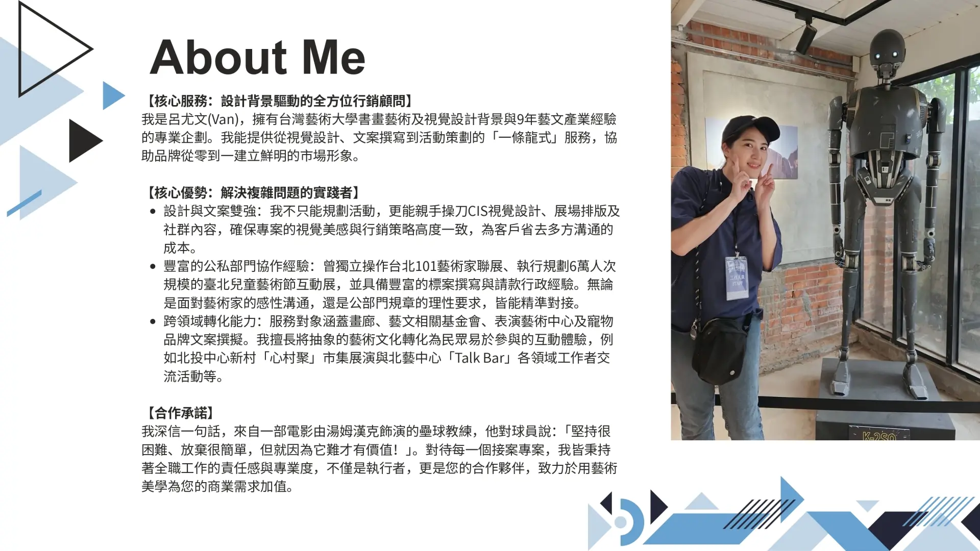 【核心服務:設計背景驅動的全方位行銷顧問】 我是呂尤文(Van),擁有台灣藝術大學書畫藝術及視覺設計背景與9年藝文產業經驗的專業企劃。我能提供從視覺設計、文案撰寫到活動策劃的「一條龍式」服務,協助品牌從零到一建立鮮明的市場形象。 【核心優勢:解決複雜問題的實踐者】 設計與文案雙強:我不只能規劃活動,更能親手操刀CIS視覺設計、展場排版及社群內容,確保專案的視覺美感與行銷策略高度一致,為客戶省去多方溝通的成本。 豐富的公私部門協作經驗:曾獨立操作台北101藝術家聯展、執行規劃6萬人次規模的臺北兒童藝術節互動展,並具備豐富的標案撰寫與請款行政經驗。無論是面對藝術家的感性溝通,還是公部門規章的理性要求,皆能精準對接。 跨領域轉化能力:服務對象涵蓋畫廊、藝文相關基金會、表演藝術中心及寵物品牌文案撰擬。我擅長將抽象的藝術文化轉化為民眾易於參與的互動體驗,例如北投中心新村「心村聚」市集展演與北藝中心「Talk Bar」各領域工作者交流活動等。 【合作承諾】 我深信一句話,來自一部電影由湯姆漢克飾演的壘球教練,他對球員說:「堅持很困難、放棄很簡單,但就因為它難才有價值!」。對待每一個接案專案,我皆秉持著全職工作的責任感與專業度,不僅是執行者,更是您的合作夥伴,致力於用藝術美學為您的商業需求加值。