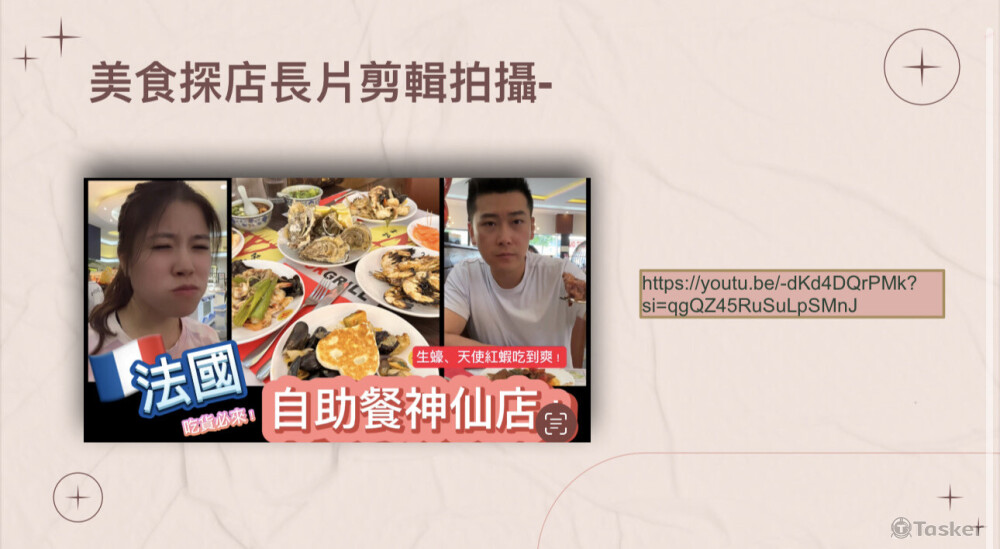 探店系列影片,主要根據客戶探訪的影片去製作成相關的美食探店系列!可以是1~2分鐘的短視頻,也可以是5~8分鐘的長視頻。