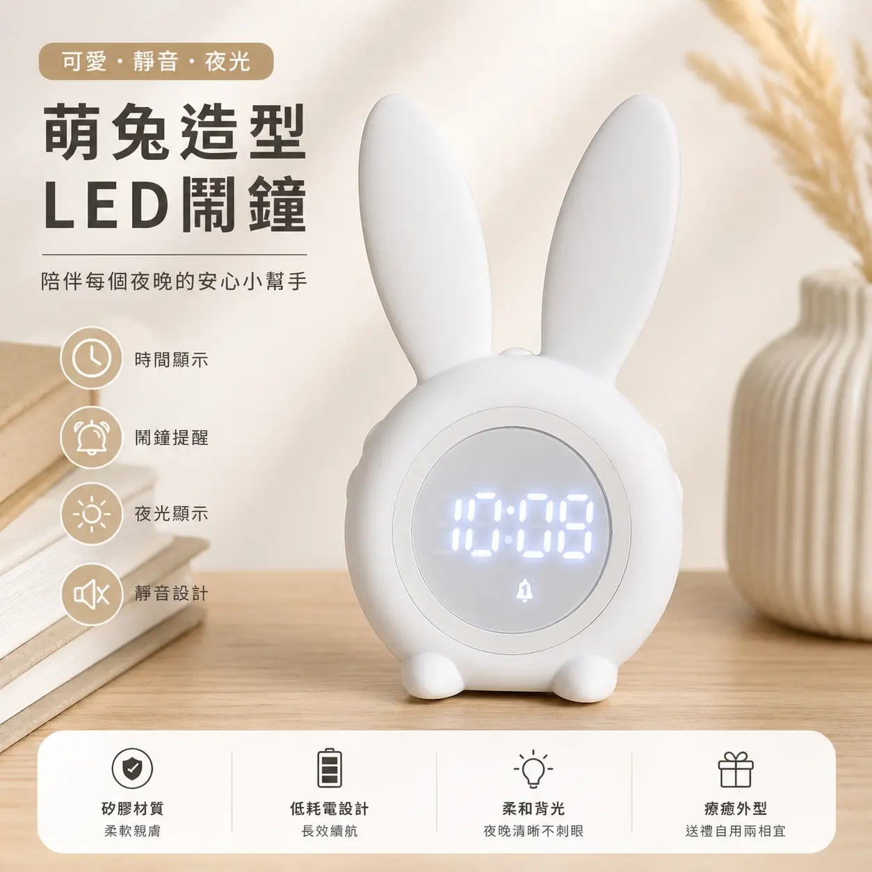 🐰 產品特色 療癒萌兔設計 圓潤機身搭配可愛兔耳造型,簡約不失童趣,無論放在床頭、書桌或兒童房,都能瞬間提升空間質感。 柔和 LED 顯示 清晰數字搭配溫潤光源,夜間查看時間不刺眼,給你舒適的視覺體驗。 貼心鬧鐘提醒 準時喚醒每一天,鈴聲溫和不突兀,讓早晨更輕鬆愉快。 靜音設計 無滴答聲干擾,打造安靜睡眠環境,特別適合淺眠者與孩童使用。 溫柔夜燈功能 夜間自帶柔光,陪伴入眠,也方便半夜起床使用。 🌿 使用情境 床頭鬧鐘|陪你安心入睡、準時起床 書桌擺設|療癒系小物提升專注力 兒童房配件|可愛又安全的時間小幫手 禮物首選|實用與外型兼具的暖心禮物 ✨ 設計理念 以「簡約 × 可愛 × 實用」為核心,打造一款既是生活工具,也是空間裝飾的高質感產品,讓每個日常時刻都多一點溫柔。
