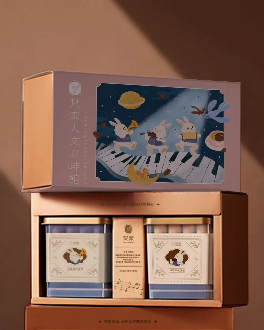 此為咖啡品牌「梵索 VANSO COFFEE」之概念視覺設計, 以「音樂 × 咖啡」為核心,發展節慶禮盒包裝。 透過插畫風格營造品牌氛圍, 提升產品在送禮市場的質感與記憶點, 並強化整體視覺一致性。 本案例展示從品牌概念發想、插畫設計到包裝應用的整合能力。